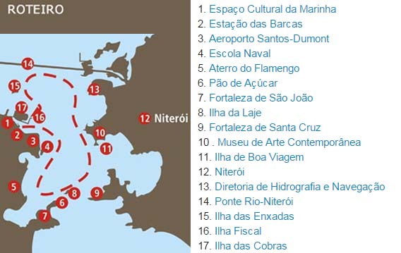 O passeio começa pelos edifícios (históricos) do próprio complexo do Centro Cultural da Marinha, que fica na Ilha das Cobras cuja história data a época do Brasil-Colônia. Atualmente, a ilha abriga o complexo do Arsenal de Marinha do Rio de Janeiro (AMRJ), o Hospital Central da Marinha, o Centro de Perícias Médicas da Marinha, o Comando Geral do Corpo de Fuzileiros Navais, o Presídio da Marinha, o Serviço de Documentação da Marinha e Diretorias Especializadas de Intendência de Guerra.