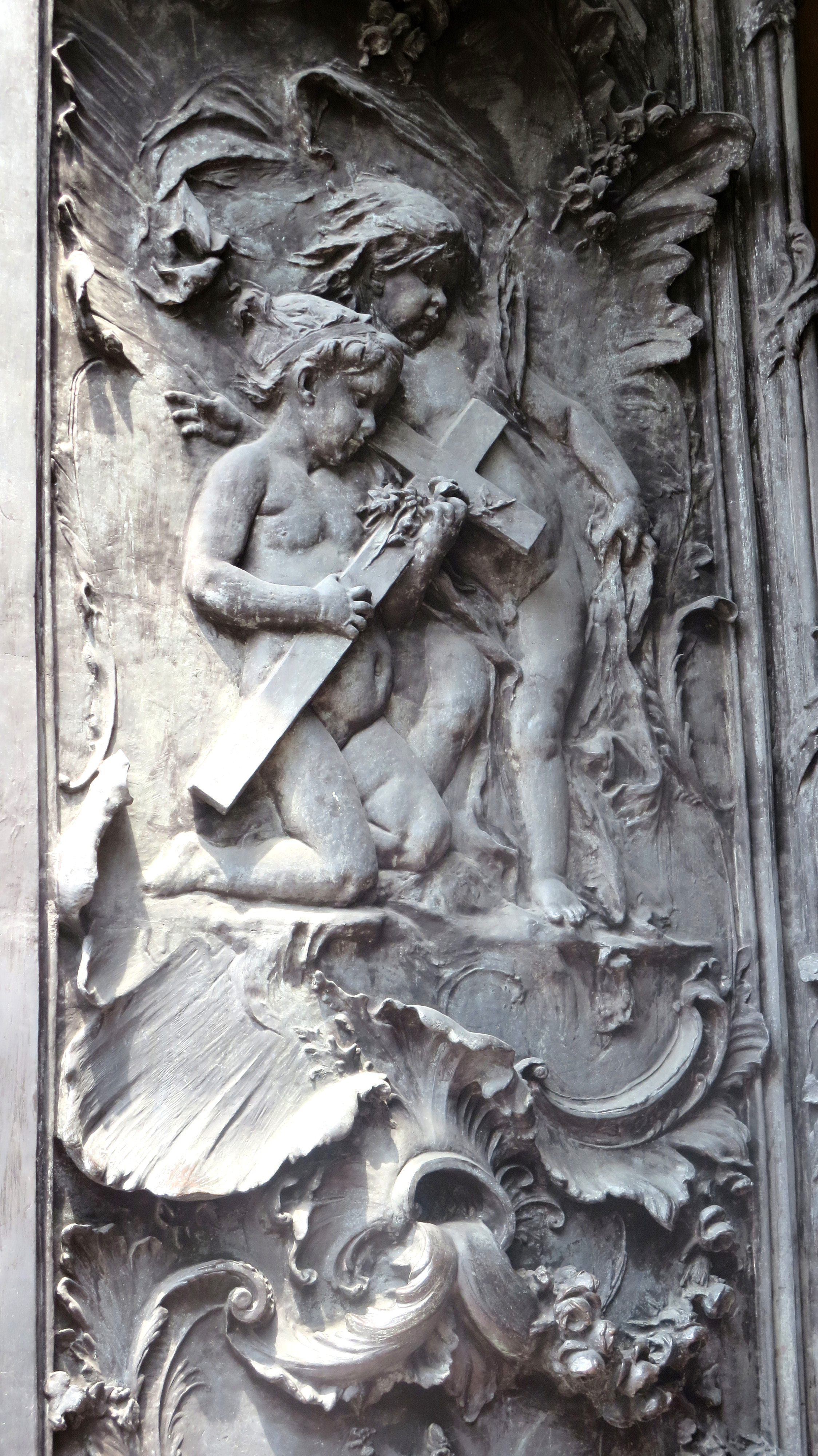 Fachada e detalhes das portas de bronze, esculpidas pelo português Teixeira Lopes, durante a reforma do século XIX.