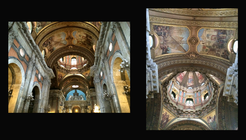 Há belíssimos vitrais, portas esculpidas em mármore. Observe estes vitrais na área do coro. Foram danificados por pedras jogadas da rua na fachada. Uma pena.