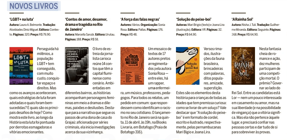 Clipping Jornal O Globo – Segundo Caderno – Lançamentos – 6-4-2024 Jornal O Globo – Segundo Caderno – Lançamentos – 6-4-2024 Jornal O Globo – Globo Bairros – Tijuca – 6-4-2024 PublishNews – Julho 2024 Revista Traaços – Novembro 2024 Compartilhe isso: Compartilhar no X(abre em nova janela) 18+ Compartilhar no Facebook(abre em nova janela) Facebook Curtir Carregando...